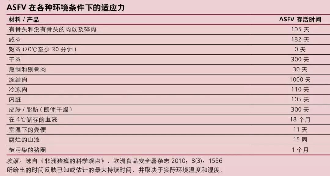1、非洲猪瘟病毒(ASFv)在猪场内各种被污染物中的存活时间