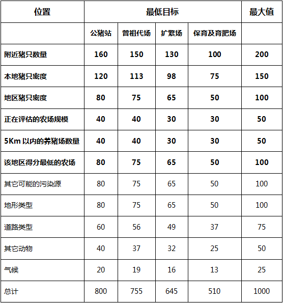 ● 重新进行猪场地理位置与防疫环境评估:可借助软件评分系统或者兽医临床经验、非瘟流行病学调查。评估因素包括以猪场为中心点5Km范围内养殖场的饲养量、养殖场的距离、主风向、与公路的距离、公路上活体动物过往的频率、地势地形、与河流的距离、与死猪填埋场的距离、与其他养殖场的粪污处理地的距离、与附近屠宰厂的距离等等。