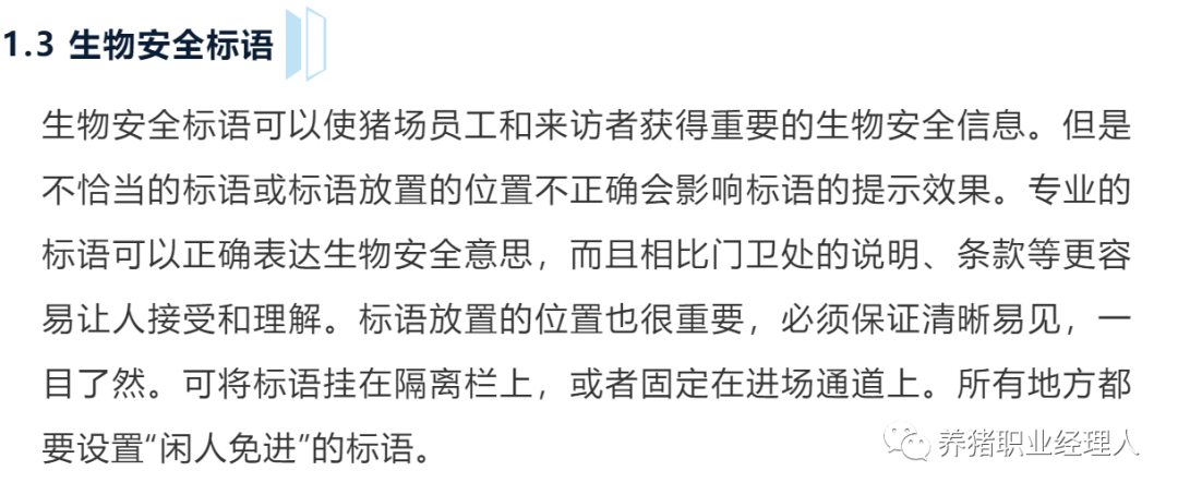 在兽医的协助下建立适合本场的生物安全手册,最好每个涉及生物安全操作的细节都建立标准操作流程(SOP)。同时要加强场内员工生物安全意识的培训,使其充分理解并遵循所制定的生物安全规章,形成良好的规范标准并成为企业文化的一部分。所以要定期对场内所有员工进行生物安全知识的培训,每年至少4次以上,培训应使员工清楚了解下列内容: