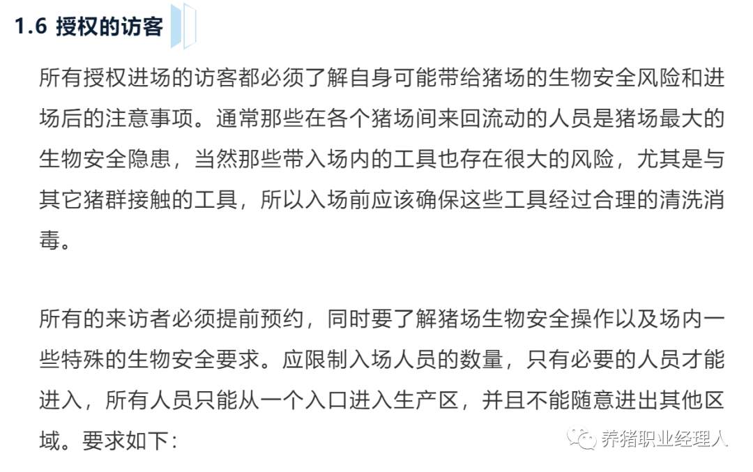 指评估来访人员引起疫病的可能性及严重程度。通过界定主要风险因子,来确定并制定防控的方法和方案。同样的道理,可以通过风险评估设计好猪只、饲料等的转运、线路选择等等。
