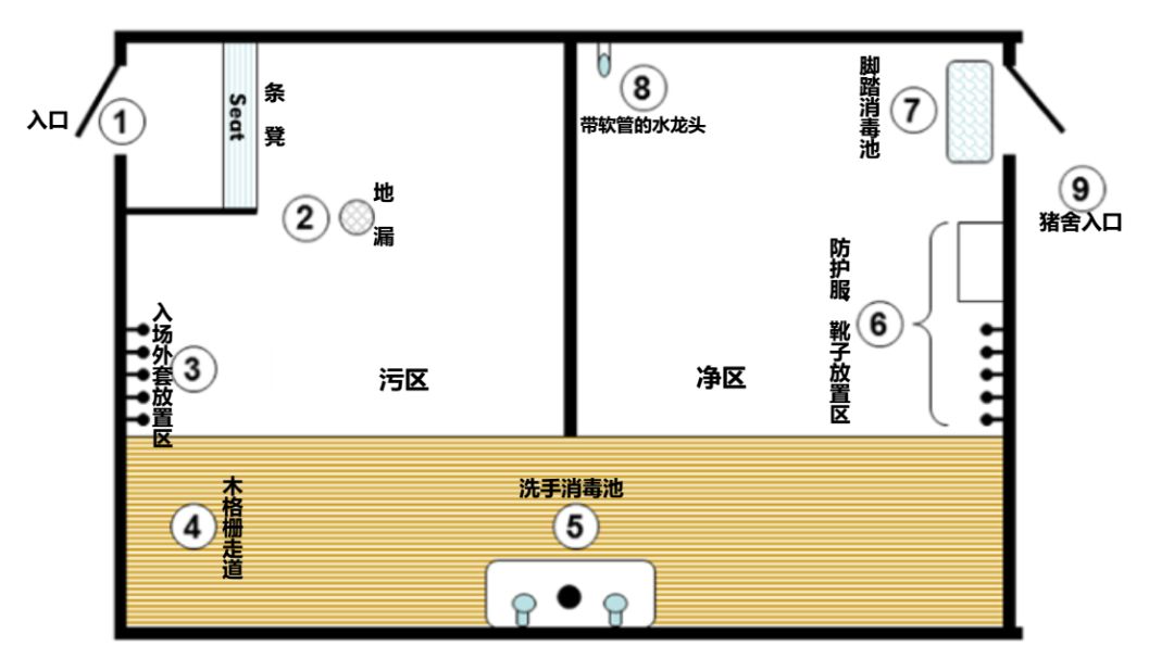 ⑦ “净-污区”标识清楚以便入场人员知道哪些区域需要更换衣服和靴子,进猪舍前确保所有访问人员穿戴洁净服、靴子和手套。