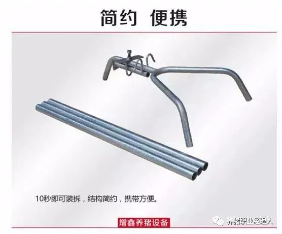经过几十次的实验以及结合众多养殖户的反馈意见,第三代阉猪神器面世了。如上图所示,第三代阉猪神器加了U型调节器之后,可随意调节垫板与弯钩之间的高度,广泛适用于7-45日龄的仔猪阉割。三个脚架也采取可拆卸式,装卸简单,而且不使用的时候可以拆下来,这样占用的空间就大大减小,也方便携带以及运输。整个神器仅重7公斤,这可以保证仔猪阉割时候挣扎不会将整个架子掀翻。而神器使用的加厚镀锌管十分耐用,赖强瑞表示,这样的一个阉猪神器可使用10年以上。