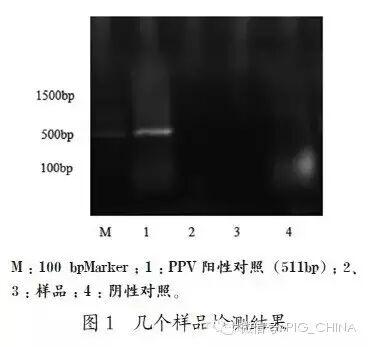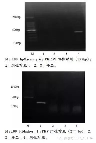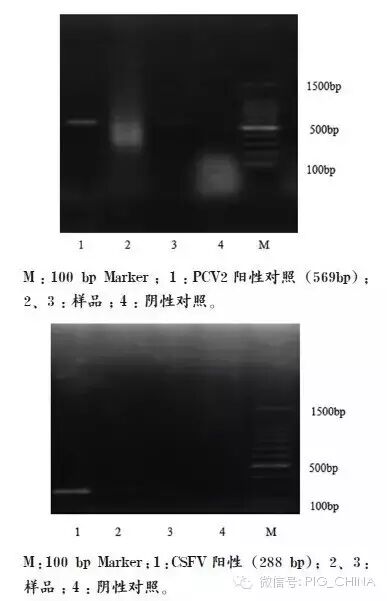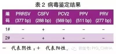 针对常规病毒的检测:将病料(肝、脾、肺、肾、脑)进行无菌研磨,抽提DNA、RNA,将RNA进行反转录,用引物进行PCR扩增,琼脂糖凝胶电泳进行鉴定,结果显示:2份病料中均检测到猪瘟(CSFV),1份病料检测出猪圆环病毒(PCV2),其余均检测为阴性。结果如表2。