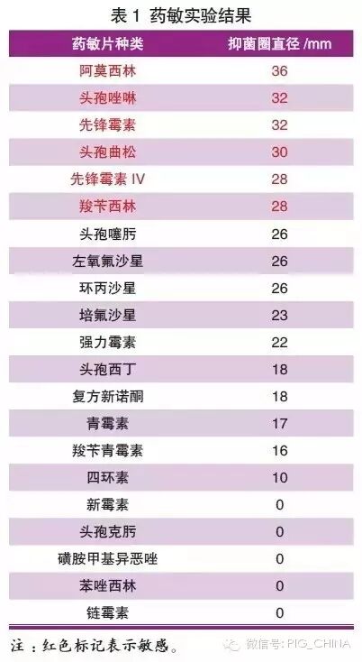 对分离到的细菌进行药敏试验,结果表明分离菌株均对阿莫西林、先锋霉素和头孢唑啉敏感,如表1。