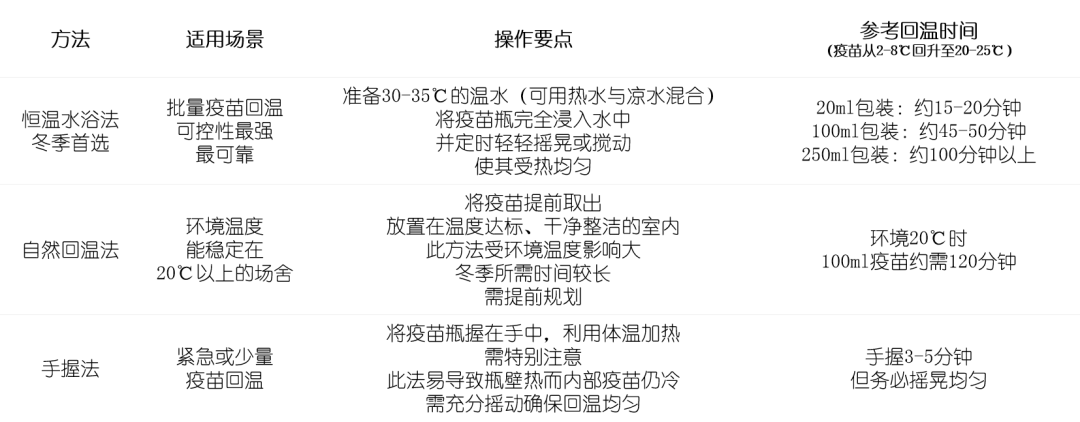 冬季环境温度低,疫苗自然回温速度慢,因此更推荐使用可控性更强的主动回温方法。以下三种是主流方法,您可以根据猪场的实际情况选择。