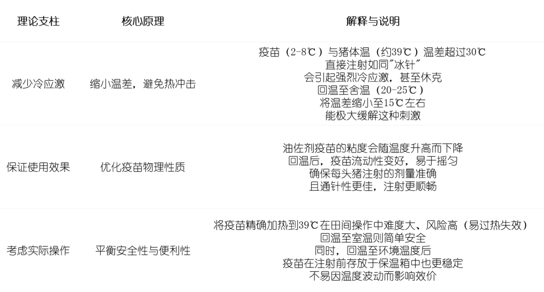 确实,“回温至室温而非猪的体温”这个操作并非简单的经验之谈,而是有明确的科学依据的,主要目的是在减少应激和保证疫苗效果与操作便利性之间取得最佳平衡。