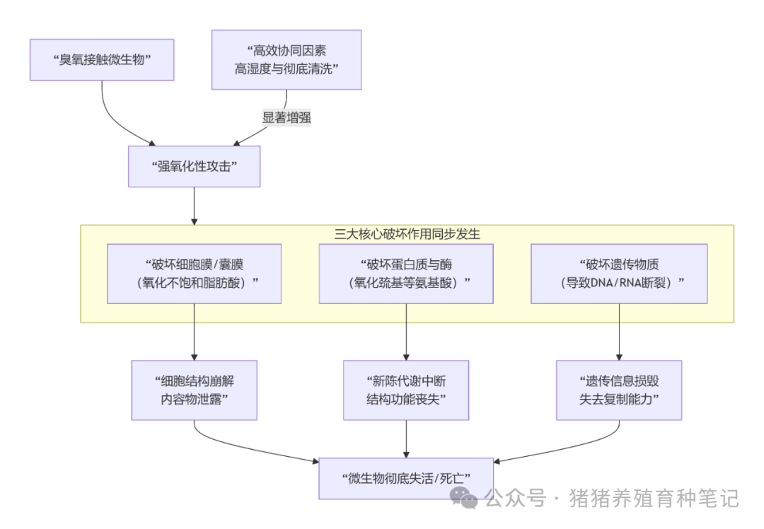 臭氧能氧化细胞膜磷脂双分子层中的不饱和脂肪酸,形成过氧化物,破坏细胞膜的通透性和完整性。从而导致细胞内容物(如蛋白质、核酸)外泄,细胞溶解死亡。对于有囊膜的病毒(如非洲猪瘟病毒、流感病毒、蓝耳病毒),这一过程尤为迅速有效。