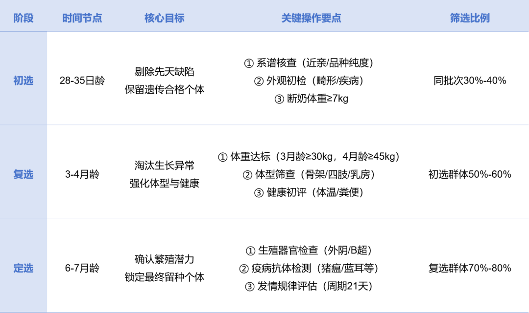 目标:通过科学分阶段筛选与多维度评估,确保后备母猪具备优良遗传潜力、健康体质及高效繁殖性能,保障猪场种群质量与经济效益。