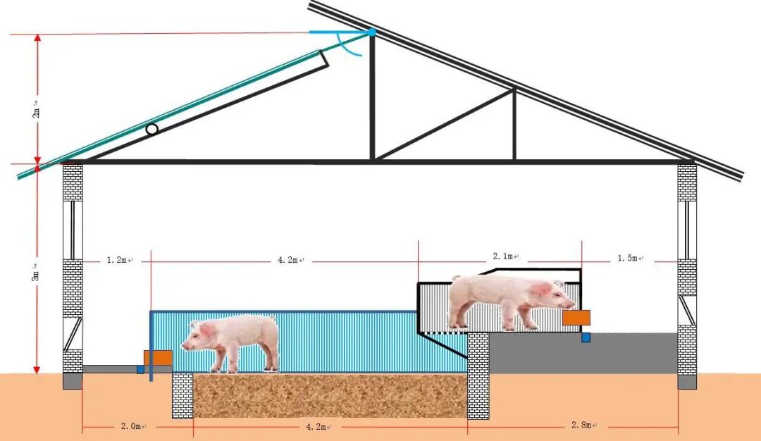 对于我上图单边悬空猪舍而言,这个尺寸并不是固定的。而上面的尺寸也是只是其中的一个设计版本而已,这个你也可以进行参考,然后与实际的情况结合就可以了。它的设计基本要求就是产床悬空的位置,这个不能太长,这样不利于产床的稳定性。一般产床长度基本在2.1米左右,而悬空的部分基本控制在50-80公分基本就可以满足猪在产床上的排泄问题,主要是要保障排泄物排到发酵床上。而产床与发酵床需要保持一定的高度,不然发酵床的猪不能活动到产床下面,这样排泄物不能充分的与微生物进行充分的结合,分解效果会差一些,基本要保障50公分的高度,因为发酵床上填充物会不断的下沉的,不要预留太高。