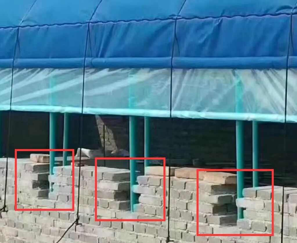 从上面的设计剖面图上基本可以简单的看出来,骨架是固定在墙体里面的。对于这样的设计来讲,骨架的稳定性更加的高。它是在整个墙体的建设过程中会在墙体上预留骨架的放置位置,或另一种方式就是骨架在底部的水泥条形基础上进行固定,而后有起的墙体。对于预留骨架位置的墙体而言,骨架在放置后需要采用水泥砂浆进行一体化的浇筑,而且这个墙体的高度基本在1.5米左右,不仅有保温的作用,还解决骨架牢固的问题。