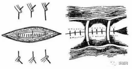 对于缝合处组织张力大,全身情况较差时,为防止切口裂开可采用此法,主要用于腹壁切口的减张。缝合线选用较粗的丝线或不锈钢丝,在距离创缘2-2.5cm处进针,经过腹直肌后鞘与腹膜之间均由腹内向皮外出针,以保层次的准确性,亦可避免损伤脏器。缝合间距离3-4cm,所缝合的腹直肌鞘或筋膜应较皮肤稍宽。使其承受更多的切口张力,结扎前将缝线穿过一段橡皮管或纱布做的枕垫,以防皮肤被割裂,结扎时切勿过紧,以免影响血运。