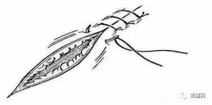 缝合时左手执有齿镊,提起皮肤边缘,右手执持针钳(执法见前面章节),用腕臂力由外旋进,顺针的弧度剌入皮肤,经皮下从对侧切口皮缘穿出。