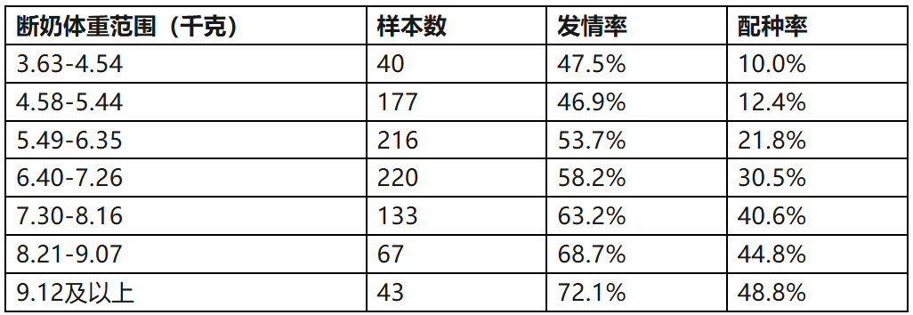 多位研究者发现,断奶前生长速度与繁殖指标呈正相关。表1为某商业化养殖体系的研究数据,表明断奶体重偏低的后备母猪,发情和配种的概率更低。