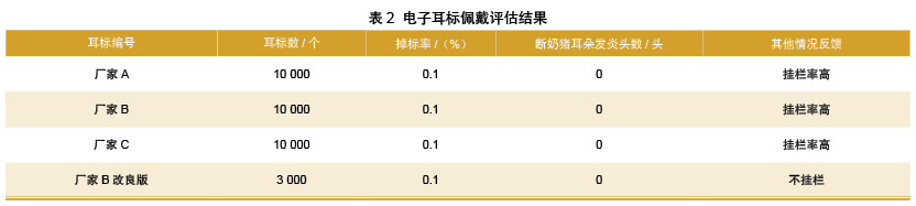 3个厂家的电子耳标掉标率均为0.1%,无明显差异,且断奶时未出现耳朵发炎现象。但是3款电子耳标佩戴后耳标重量较重,初生仔猪出现歪脑袋情况,且耳牌易挂在栏杆上(见图1),导致挂栏率偏高。如果猪栏的隔栏是栅栏型的,会导致猪只耳朵撕裂,造成极大应激。经过与厂家B的沟通,设计出改良版电子耳标,改良后重量减少,柔软度提升,挂栏现象大幅度减少,掉标率无变化,数据如表2所示。