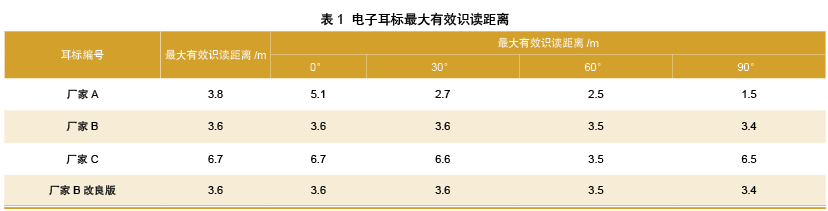 群读功能是电子耳标在规模化养殖场中的重要应用场景。然而,本研究的试验结果显示,所有厂家的电子耳标在群读功能上均无法达到100%的准确率。高效的群读功能对于提高管理效率至关重要,因此如何优化群读功能仍是未来研究的重要方向。