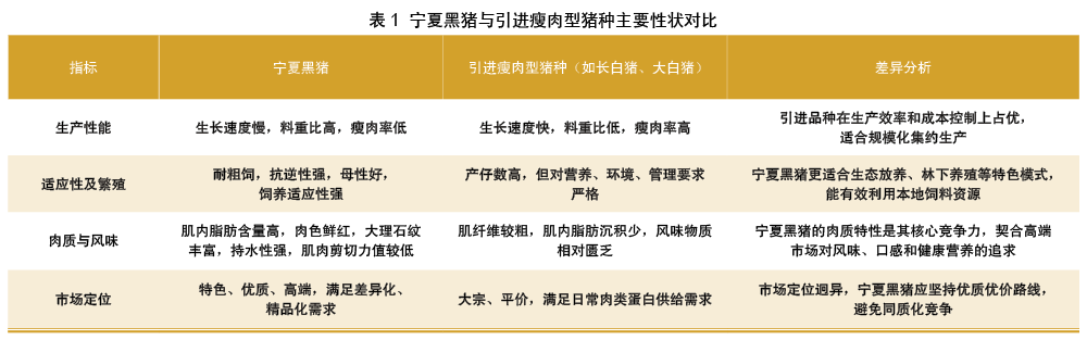 宁夏黑猪与主流引进瘦肉型猪种在关键经济性状和肉质指标上存在系统性差异,二者优势互补,具体对比见表1。