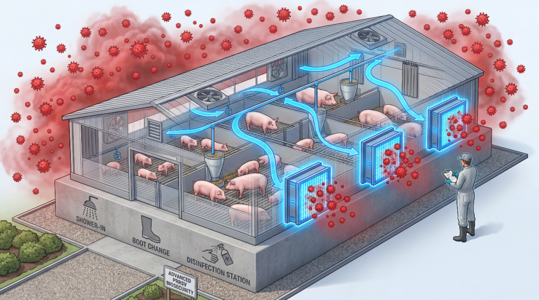 猪繁殖与呼吸综合征(PRRS,俗称蓝耳病)依然是生猪养殖中最棘手且成本高昂的疾病之一。过去,空气过滤技术主要应用于母猪场和公猪站,在生长育肥猪舍中普及率较低。然而,随着猪只饲养密度增加、区域疾病压力上升以及疫情的反复,部分生产商开始重新评估:空气过滤能否作为断奶至育肥期(Wean-to-Market)的有效生物安全辅助工具?