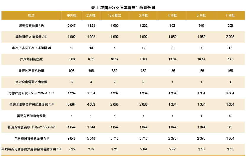 以单批次销售2 000头仔猪,即每批分娩166窝为例,不同批次化方案的相关生产数据见表1。