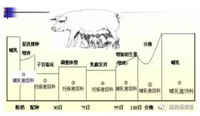 为了促进1胎母猪乳腺的发育,1胎母猪所带仔猪一般为较大的、与其有效乳头数相当的仔猪;若产仔数较少的分娩日,1胎母猪也要比平均带仔数多带。2胎或3胎的哺乳母猪因为乳头较小,乳房发育得较好,较1胎母猪更加温和,免疫力也较强,一般作为奶妈猪饲养。所以像1胎和奶妈猪这一类的母猪饲喂也应重点关注,通常采取自由采食的方式进行哺乳期饲喂。