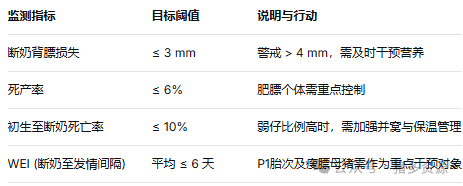 目标指标:死产率、初生至断奶死亡率、断奶体重与均匀度、母体背膘损失(mm或BCS)、断奶至发情间隔(WEI)、下胎窝产活仔。