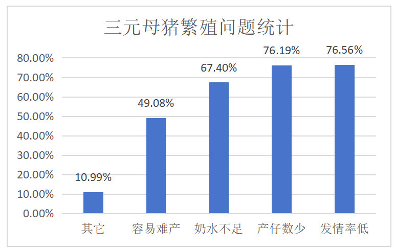 在非洲猪瘟影响下,三元母猪被广泛留作种用已成为常态,而初配不达标则进一步引发了更多繁殖障碍。PSY应用研究院对全国765家猪场三元母猪使用情况的调研显示,普遍存在发情率低、产仔数少、难产率高及奶水不足等问题(图2),严重制约了猪场产能的恢复进程,必须引起充分重视。