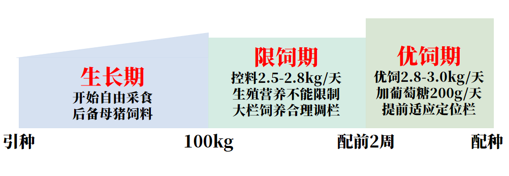 后备母猪的饲养需兼顾采食量与营养供给。其饲喂管理可分为三个阶段:生长期、限饲期和优饲期,各阶段具体操作如图所示。此外,建议全程在饲料中添加生殖营养“仔多多”(0.5kg/t),以促进生殖系统健康发育。