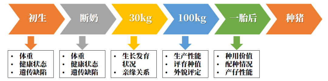 按时间顺序,后备母猪的选留可分为五个关键阶段:初生、断奶、30kg、100kg及一胎后。每个阶段均有其评估重点,具体可参考相关图示。对于商品猪场,若为外购引种,应特别关注30kg左右的引种初期和100kg阶段,即在引种回场一周内及首次诱情后一周,做好选留工作。