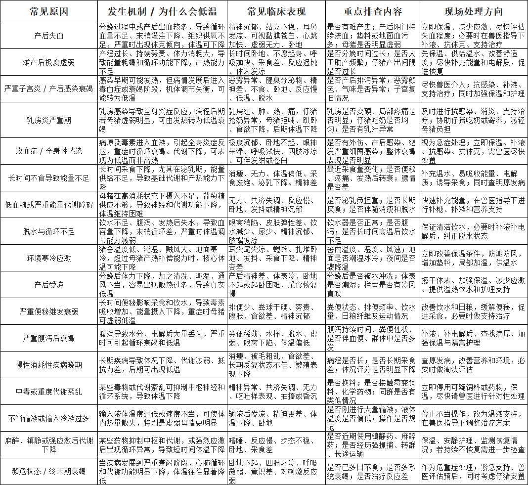 严重疾病后期:如高致病性蓝耳病、猪瘟、非洲猪瘟、急性细菌性败血症(链球菌、大肠杆菌)的濒死期。此时机体能量耗竭,代谢中枢失代偿,体温不升反降,是预后极差的标志。