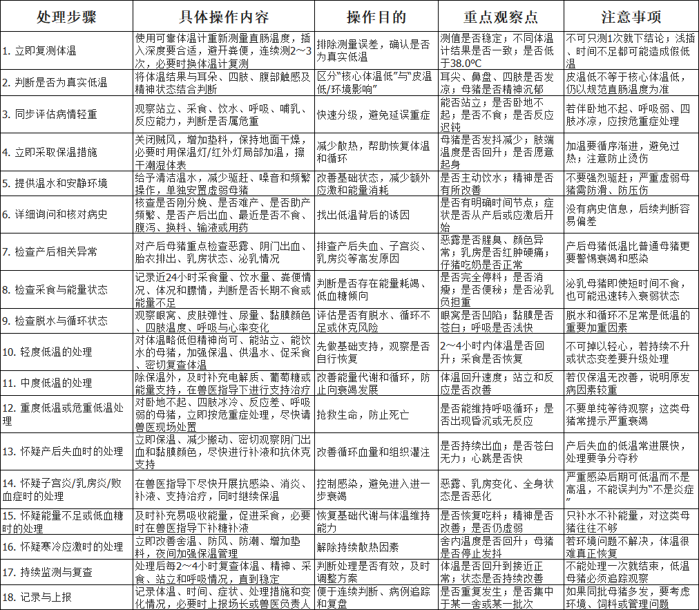 判断建议:当测得体温低于37.5℃(正常为38-39.5℃),应先复测。复测前清理直肠粪便,插入足够深度,使用校准过的体温计,并在母猪相对安静、站立或躺卧平稳时测量。两次测量结果一致才可确认。