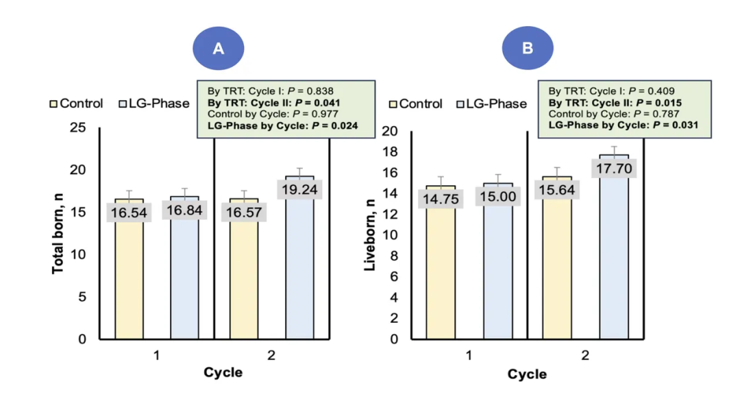 总产仔数:19.24头vs.16.84头(+2.74头;P=0.041)
