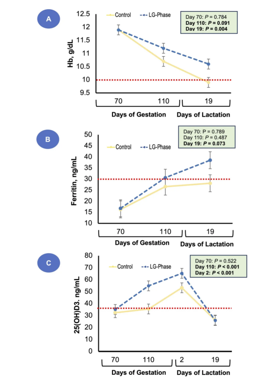 血液健康提升:产前和断奶时的血红蛋白水平更高;断奶时反映体内铁储备的铁蛋白指标更优。