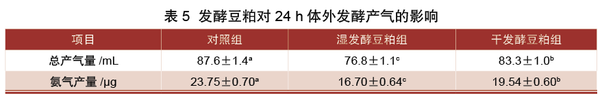 与戊酸和异戊酸一样,氨气也代表大肠蛋白质的发酵程度。仔猪大肠中绝大部分微生物都能分解底物产生氨气,但产氨能力有强有弱,不同微生物群落结构对底物的利用情况不同,氨气产量也不同。仔猪大肠内容物24 h体外发酵产气情况见表5。湿发酵豆粕组的总产气量和氨气产量均显著低于干发酵豆粕组(P<0.05),干发酵豆粕组的显著低于对照组(P<0.05),且湿、干发酵豆粕组的氨气产量较对照组分别降低了29.68%和17.73%。