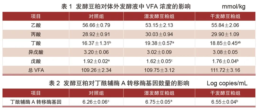 丁酰辅酶A转移酶是丁酸产生的关键酶。由表2可见,湿发酵豆粕组丁酰辅酶A转移酶基因数量显著高于干发酵豆粕组(P<0.05),干发酵豆粕组的显著高于对照组(P<0.05)。发酵豆粕对仔猪大肠内容物24 h体外发酵液中丁酰辅酶A转移酶基因数量的影响与丁酸的一致(表1)。