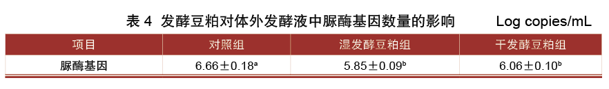 仔猪大肠内容物24 h体外发酵液中脲酶基因数量见表4,湿、干发酵豆粕组的脲酶基因数量显著低于对照组(P<0.05),湿发酵豆粕组的低于干发酵豆粕组,但差异不显著(P>0.05)。