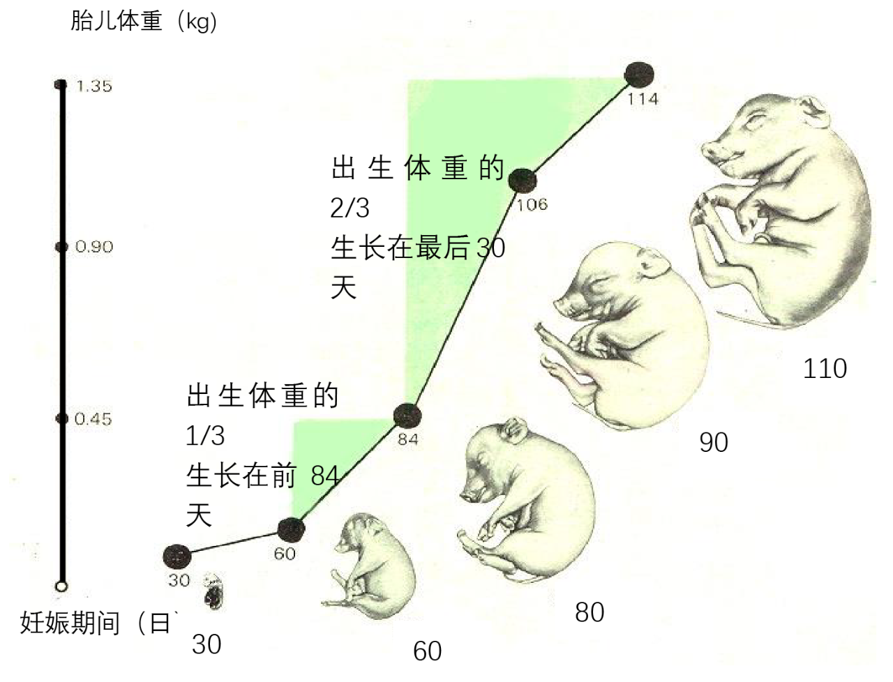 【技术要点】:此阶段是母猪体况调整黄金期,同时也是乳腺发育启动阶段,需依体况精准饲喂,保障胎儿与母猪自身营养需求。