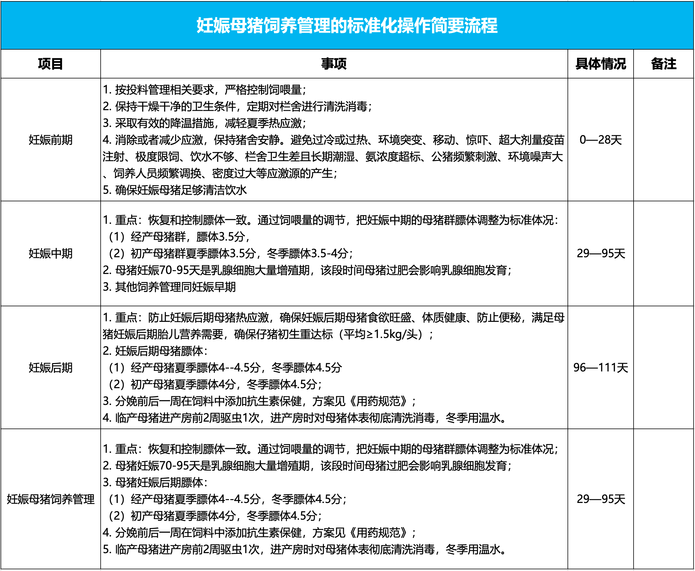 【技术要点】:此阶段胚胎着床尚不稳定,减少应激是核心,同时适当控膘,防止母猪过肥或过瘦影响胚胎发育。