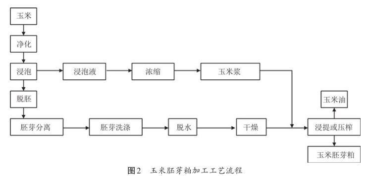 目前,玉米胚芽粕是几种玉米副产物中产量最高的成分[14]。由于玉米原料的质量差异较大,生产的玉米胚芽粕性质也有差异,高蛋白玉米生产出的玉米胚芽粕属蛋白饲料,其余是能量饲料。玉米胚芽粕也是在商品淀粉加工中产生的,酸泡后将玉米胚芽分离出来,浓缩玉米浆与玉米胚芽混合后经浸提压榨得到玉米油,剩余的部分就是玉米胚芽粕[15]。玉米胚芽粕加工工艺流程见图2。