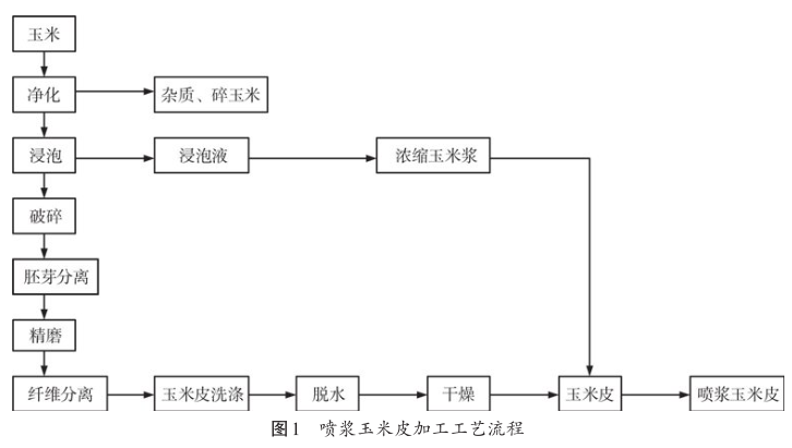将玉米浸泡后的浓浆喷洒在玉米胚芽和纤维分离后的玉米皮上形成喷浆玉米皮[10-11]。在淀粉生产过程中,在(50±2)°G环境温度下,用0.07%~0.18%的亚硫酸浸泡玉米,浸泡时间不少于26h,保留浸泡后的浓浆(浓缩玉米浆),用破碎机将酸泡后的玉米破碎至胚芽分离,胚芽可以制成玉米胚芽粕,剩余部分进行纤维分离,分离出玉米皮,与浓缩玉米浆混合,形成淀粉加工副产物即喷浆玉米皮[12]。喷浆玉米皮的加工工艺流程[13]见图1。
