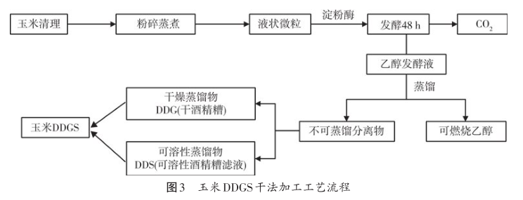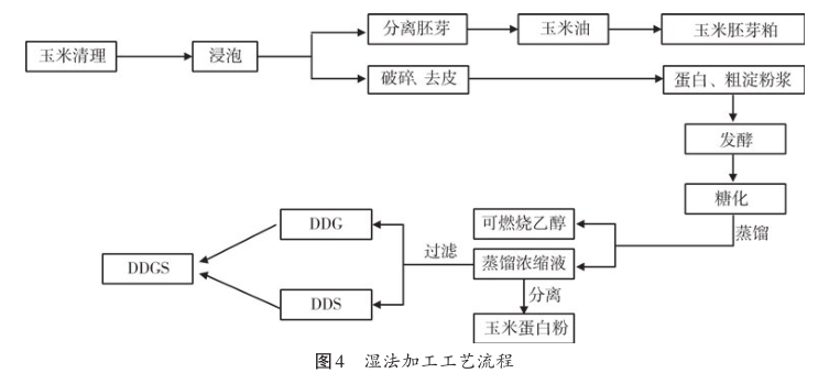 玉米干酒糟及其可溶物(distillers driedgrainswith solubles,DDGS)通常是生产工业乙醇过程中产生的副产物。本文介绍了干法和湿法两种玉米DDGS加工工艺。干法加工时,玉米粉在淀粉酶作用下发酵48h形成乙醇发酵液,经过蒸馏分离出不可蒸馏部分即得到玉米DDGS。干法加工工艺流程见图3。湿法加工时,先将玉米酸泡,去皮后形成粗淀粉浆,经发酵和糖化后生产乙醇,蒸馏浓缩液分离后得到DDGS,湿法加工同时可以得到玉米油、玉米蛋白粉、玉米胚芽粕和乙醇等产物,湿法加工工艺流程见图4。干法生产玉米DDGS时由于无法将玉米中的营养物质从乙醇废液中分离出来,造成原料浪费和环境污染[16]。湿法的综合效益较高,不仅生产乙醇量大,更能较好地保证玉米DDGGS的营养成分,充分利用玉米营养物质,在乙醇制造中广泛使用。因此,湿法加工玉米DDGS更经济高效。