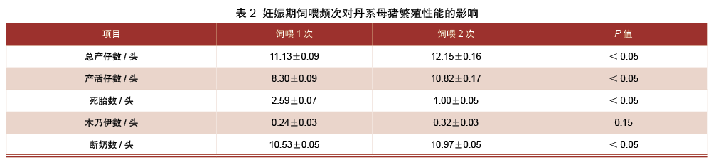 2.2妊娠期饲喂频次对丹系母猪繁殖性能的影响