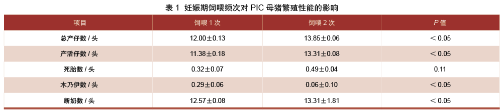 2.1妊娠期饲喂频次对PIC母猪繁殖性能的影响
