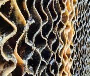 水中钙、镁、铁等矿物质随水蒸发结晶,形成白色硬垢,堵塞蜂窝孔道。